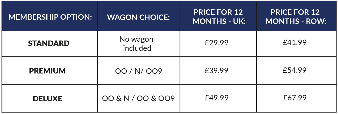 This option includes all of the benefits of the Standard Membership, plus our annual club membership wagon in either N, OO or OO9 scale depending on the option you chose for £39.99 for a 12 month membership.