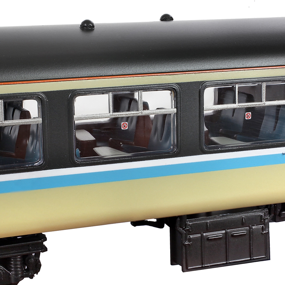 Depicting a pair of Tourist Second Opens (TSOs), these Branchline models sport all the hallmarks of the early-Mk2s including the pressure ventilation system – denoted by the roof vents and opening passenger saloon windows, sliding gangway doors, vacuum brakes – so they could run with Mk1 stock, and dual heating which allowed the coaches to be heated by steam or electric systems. Inside, the elegant armchairs and tables are modelled faithfully and decorated in authentic colours whilst externally we see the separately-fitted, metal grad handles and lamp irons, and a full complement of underframe equipment. The coaches run on B4 bogies which are fitted with metal wheelsets and a close coupling mechanism is mounted to the chassis providing close coupling whilst still allowing the models to negotiate second radius curves.